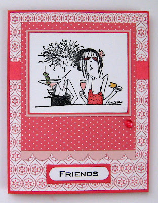 "Cheers" is the card I made for a limited supplies challenge. We were allowed to use one stamp, two colors of CS (plus a neutral), two types of embellishments (I used eyelets and a mini brad), and a tool (I used my word window punch).